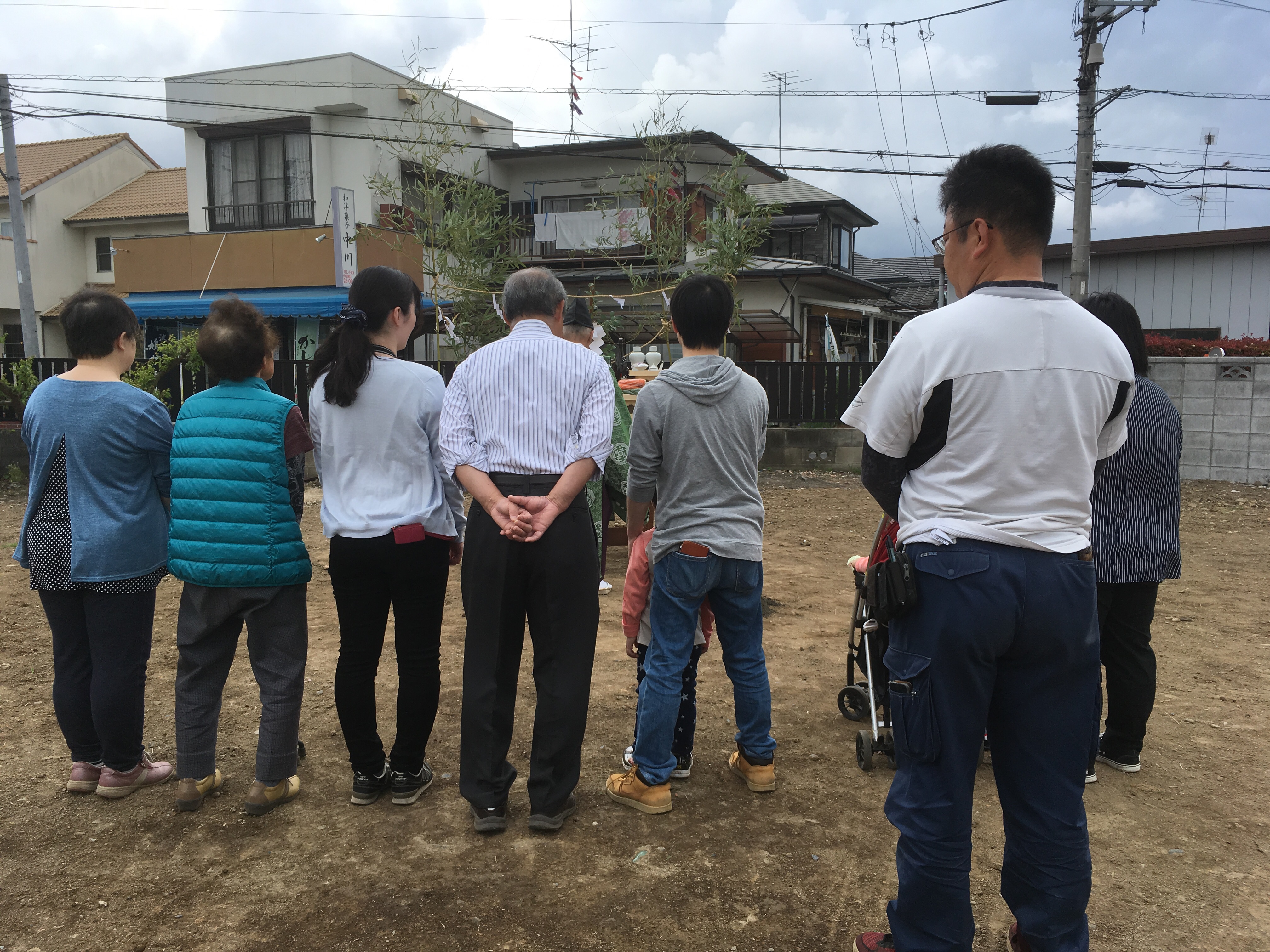 朝、少し雨がパラついていて空を見上げると、雨が心配になりましたが地鎮祭が始まる頃には、雨もすっかり上がり無事に地鎮祭が終わりました。